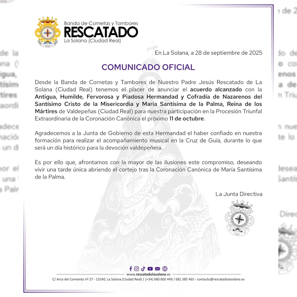 ACTUALIDAD Feria cofrade MARCO 29/11/2025 60 Aniversario, Concierto Renovación Domingo de Resurrección 2026 03/11/2025 Nuevo compromiso, Semana Santa 2026 VIII Concierto cofrade en honor a Santa Cecilia 17/10/2025 60 Aniversario, Concierto Galería fotográfica Extraordinaria María Santísima de la Palma 14/10/2025 Galería fotográfica, Salida extraordinaria XIX Certamen de Marchas Procesionales “Imperio Romano” de Moriles 14/10/2025 Concierto, Nuevo compromiso Procesión triunfal extraordinaria de la coronación canónica de María Santísima. de la Palma, Reina de los Mártires 11/10/2025 Salida extraordinaria Procesión Triunfal Extraordinaria de la Coronación Canónica de María Santísima de la Palma 29/09/2025 Nuevo compromiso Banda invitada al VIII Concierto Cofrade en Honor a Santa Cecilia 29/09/2025 60 Aniversario, Concierto Anterior 1 2 3 4 5 6 7 8 9 Siguiente