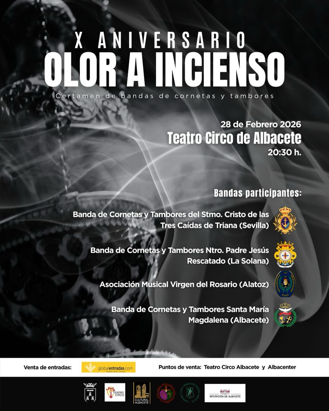 Agradecemos enormemente a la Cofradía Santa María Magdalena el querer contar con nosotros para su 10ª Edición de este Certamen de Bandas en el que sin ninguna duda, disfrutaremos de una tarde-noche de música cofrade. El certamen será el 28 de febrero en el Teatro Circo de Albacete, donde participaremos junto con la Banda de Cornetas y Tambores del Santísimo Cristo de las Tres Caídas de Triana, la Asociación Musical Virgen del Rosario de Alatoz y la Banda de Cornetas y Tambores Santa María Magdalena de Albacete.