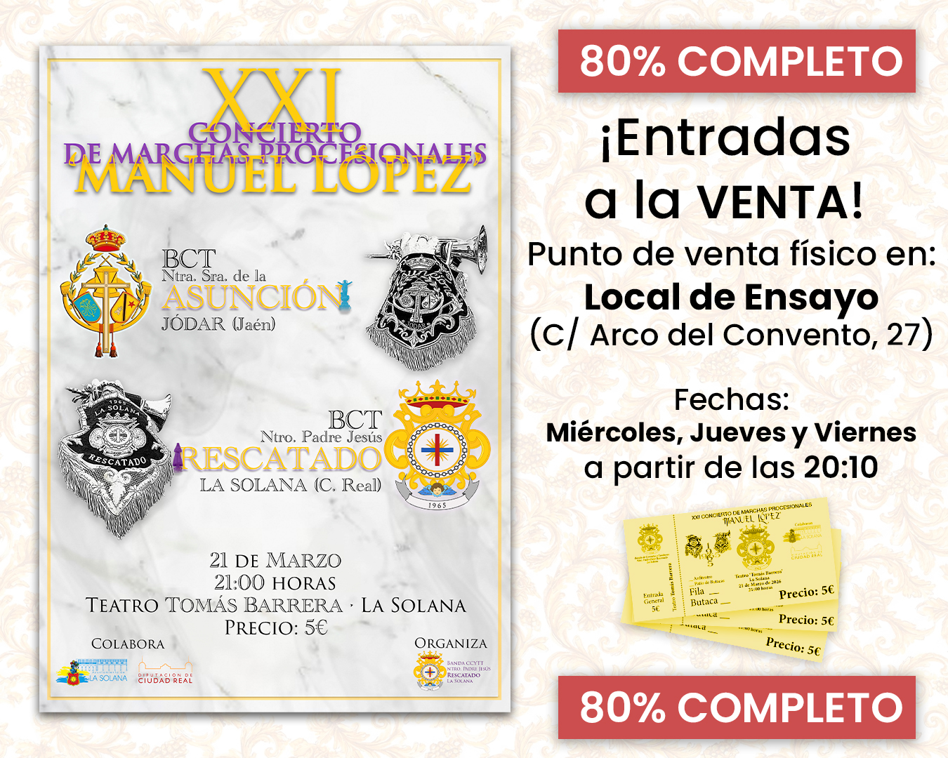 ¡Más de uno 80% de aforo vendido para el XXI Concierto de marchas procesionales «Manuel López»!