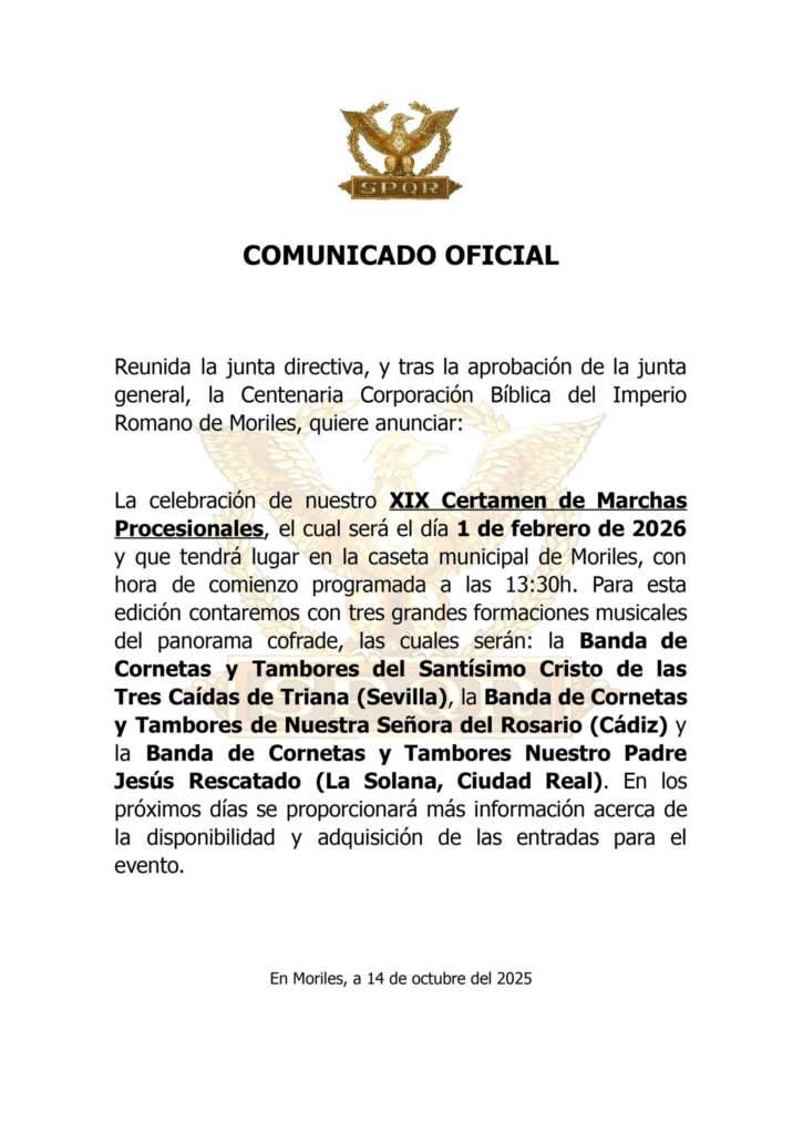 Tenemos el honor de anunciar nuestra participación en el XIX Certamen de Marchas Procesionales “Imperio Romano” de Moriles (Córdoba), organizado por Imperio Romano de Moriles.